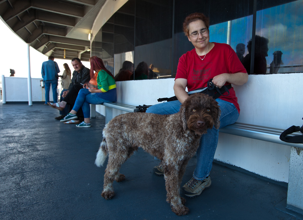 Ich weiss nicht, wer am meisten gelitten hat, die Menschen oder die Tiere, welche an Bord waren. Eigentlich stand ja im Prospekt, von der Fähre, dass es ein sogenanntes „Hundehotel“ auf dem Schiff gab, was aber mehr an einen Raum voller Käfige erinnerte, jedenfalls im Prospekt. Für uns war klar, dass dies nichts für Amadeo ist und er bei uns bleiben soll. Allerdings dürfen sich Tiere nicht im Innern aufhalten und so mussten wir den ganzen Weg, 3 Stunden, hinten an der Reeling mit leckerem Dieselgestank verbringen. Wir haben ihm vorgängig noch Notfalltropfen verabreicht, das hat so lange gewirkt, bis das Schiff Wellengang hatte, danach wollte unser lieber Schatz einfach nur noch weg. Bei mir war es so, dass ich mich kurz im Innern des Schiffes aufwärmen wollte, dies war aber ein grosser Fehler, weil es einen starken Wellengang hatte, war dies so eine Sache mit dem Gleichgewicht und da die frische Luft fehlte wurde es mir gehörig übel. So gesellte ich mich nach kurzer Zeit wieder zu Tom, was eine sehr gute Entscheidung war!!!