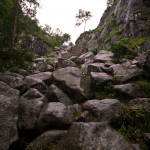 Der Weg wurde immer steiler und steiler. Zwischendurch habe ich den Wauwau schon mal über einen grösseren Stein heben müssen. Das war spätestens nach seinem Ausflug ins Moor ein ganz besonders angenehme Aufgabe. Und ja es regnete immer noch. Es hatte tierisch viele Leute. Eigentlich hatte ich ja gehofft, dass nur wir so doof wären und bei dem Sauwetter da rauf klettern würden. Ja, es war mehr klettern als gehen, zumindest Streckenweise, und das mit Hund! Wenn das die Stine wüsste :) Es gab aber noch andere Hundebesitzer die mit ihrem Vierbeiner da rauf sind.