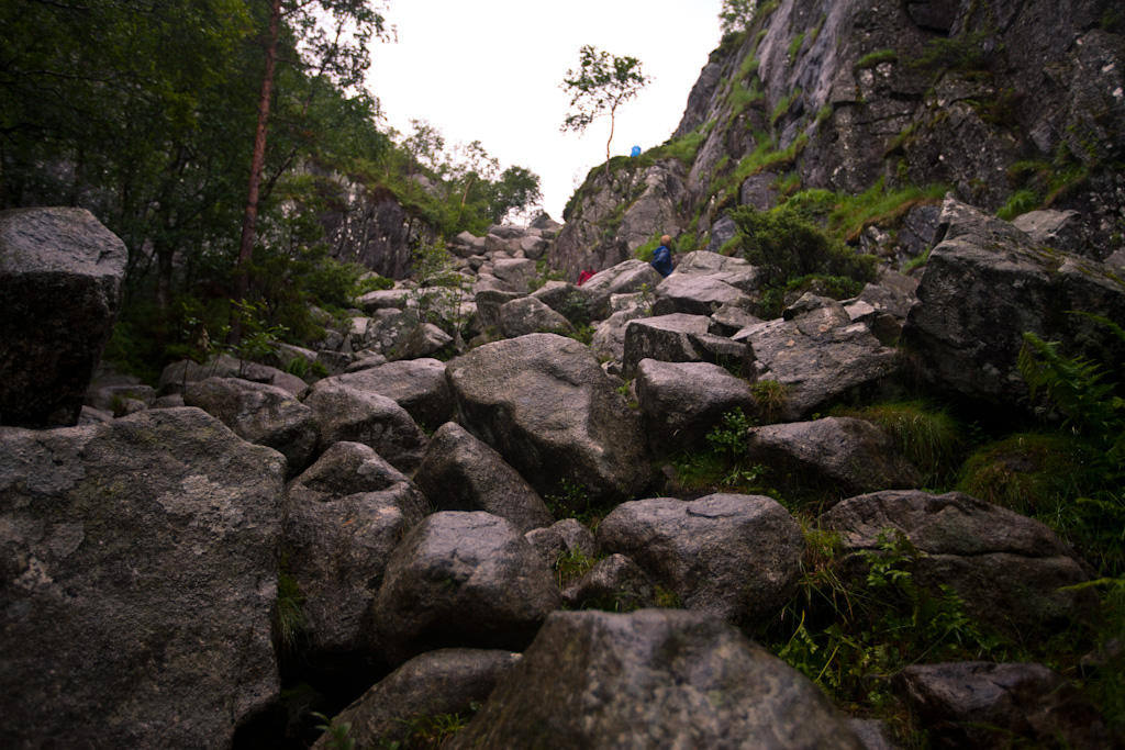 Heute Morgen der erste Blick aus dem Fenster: Richtig! Es schifft immer noch :( Also wird es wohl definitiv nichts mit einem Ausflug zum Kjeragbolten. Gegen 11 Uhr ging es dann nach einem Einkauf im örtlichen Laden los. Denn man weiss ja nie, ob es etwas zu Essen gibt. Das ist hier in Norwegen nicht so sicher. Wir fuhren durch den Regen mit der Fähre wieder zurück auf die andere Seite vom Fjord, wo es dann durch eindrückliche Landschaften bis hinauf zum Kjerag ging. Es gibt leider nur ein Foto, denn es war einfach zu nass, um draussen zu stehen und die Kamera absaufen zu lassen. Am Stefan seine DSLR hat schon die ersten Ausfälle :(